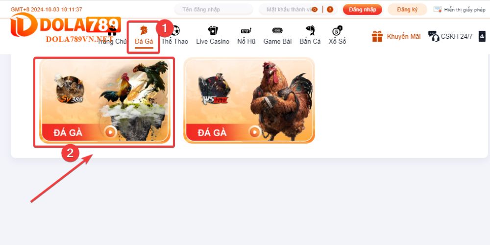 - Bước 3: Tại giao diện Dola789, bạn chọn Đá gà, vào sảnh SV388, xem đá gà CPC1, CPC2, CPC3 và dự đoán kết quả, mua vé cược, nhận thưởng xứng đáng.